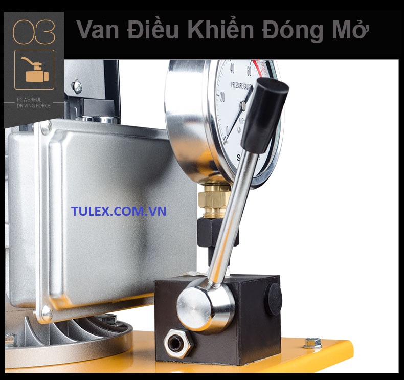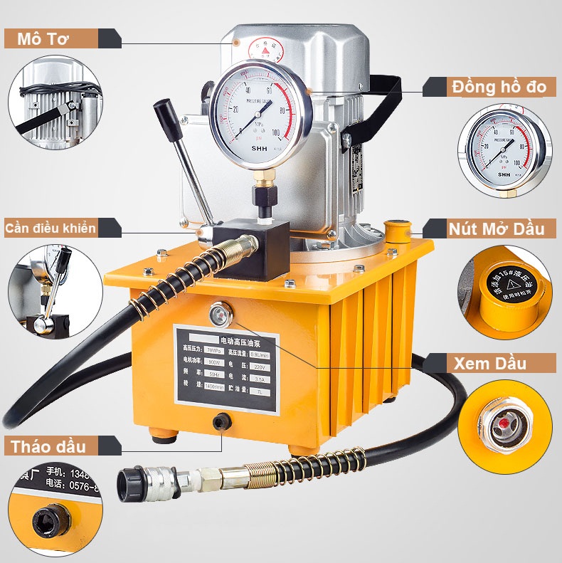 Bơm Điện Thủy Lực DYB-63F1 có trang bị hệ thống ngắt áp tự động khi vượt quá áp lực cho phép 700 bar (10.000 psi) và đồng hồ theo dõi áp lực.