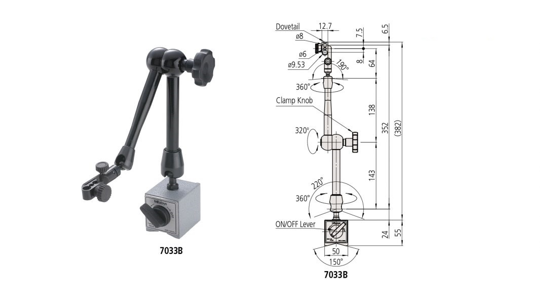 - Chân đế từ gá đồng hồ so 7033B có thể điều khiển lên xuống, xoay 360 độ dễ dàng, phù hợp để đo đạc các chi tiết có kích cỡ khác nhau, cỡ to nhỏ đều dễ dàng.