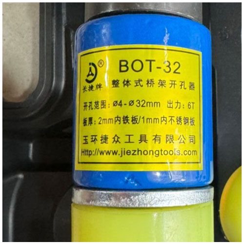 Kìm đột lỗ thủy lực BOT-32 được hãng sản xuất Jiezhong thiết kế và phát triển với những ưu điểm vượt trội khả năng vận hành êm ái, đạt hiệu quả cao khi làm việc. Máy đột lỗ BOT-32 được trang bị theo máy gồm 5 bộ khuôn chày + cối từ 16mm đến 32mm giúp cho khách hàng có thể thoải mái lựa chọn những thay đổi kích thước đột phù hợp với công trình thi công.