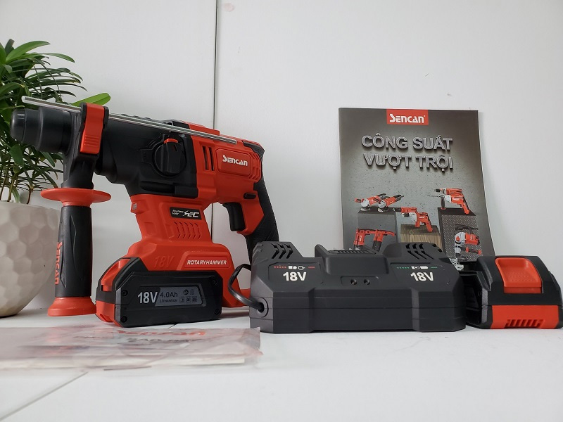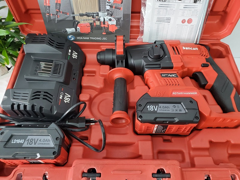 Máy khoan bê tông Sencan D722301 trang bị 2 pin 18V 4Ah, bộ sạc và hộp đựng nhựa. Hộp đựng nhựa thiết kế chắc chắn, có tổng trọng lượng cả phụ kiện và máy là 6kg, dễ dàng mang theo đến nơi làm việc.