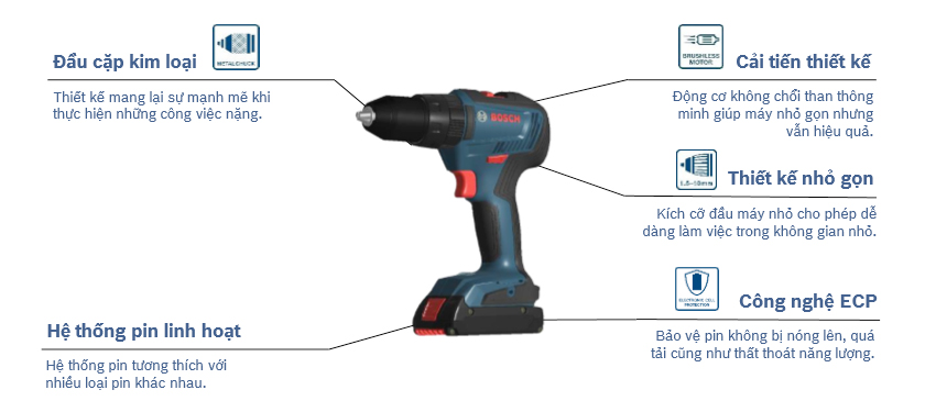 - Bosch GSB 18 v-50 18v 2.0ah li-ion hiện đại với động cơ không chổi than, tiết kiệm 15% năng lượng, tiết kiệm pin và tăng thời gian sử dụng tối đa cho máy.