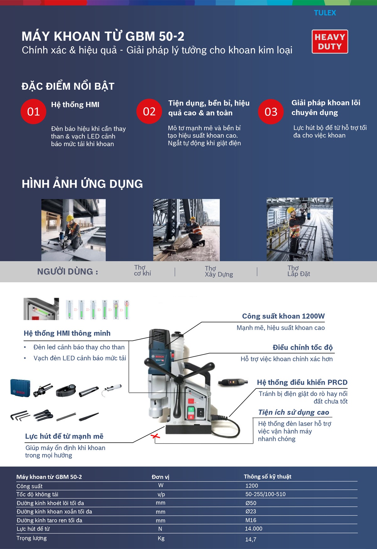 Máy khoan từ Bosch GBM 50-2 thiết bị hỗ trợ hoàn hảo cho việc gia công tạo lỗ trên bề mặt kim loại, một giải pháp tối ưu cho việc tiết kiệm tối đa thời gian và công sức của người lao động. Sở hữu hàng loạt các tính năng ưu việt cùng những cải tiến vượt trội từ những nghiên cứu mới nhất của hãng cho phép tạo ra các điều kiện thi công lý tưởng giúp việc hoàn thiện thi công trở lên dễ dàng và hiệu quả hơn.