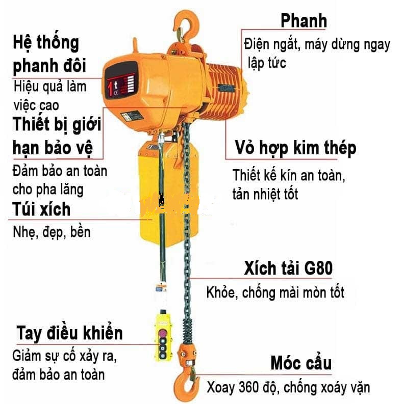 Sử dụng điện áp 380V, có khả năng làm việc liên tục trọng thời gian dài, hiệu suất cao như pa lăng xích điện di chuyển, nhưng tính linh hoạt lại kém hơn