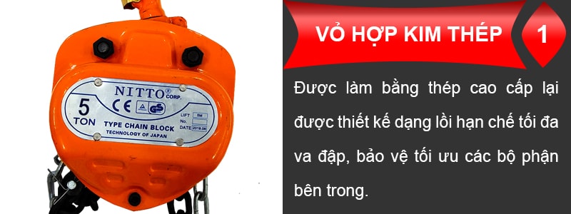 - Pa lăng xích Nitto 10t 5m có thể xoay 360 độ quanh móc treo nhằm dễ dàng xử lý tình huống kéo vật nặng.